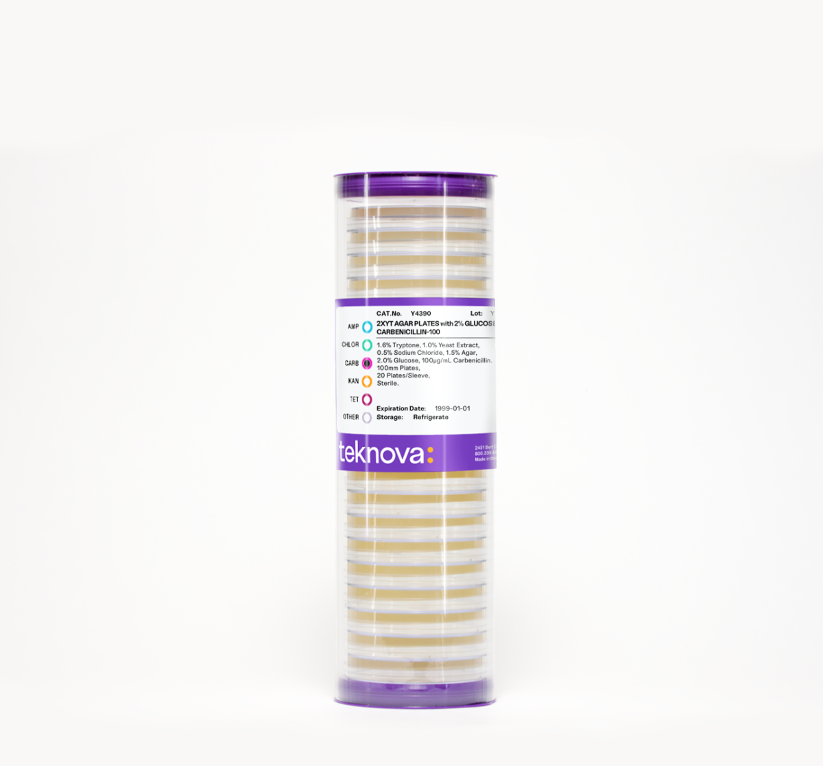 2XYT Agar Plates with 2.0% Glucose and Carb-100.100mm, 20 Plates per Sleeve, Sterile.