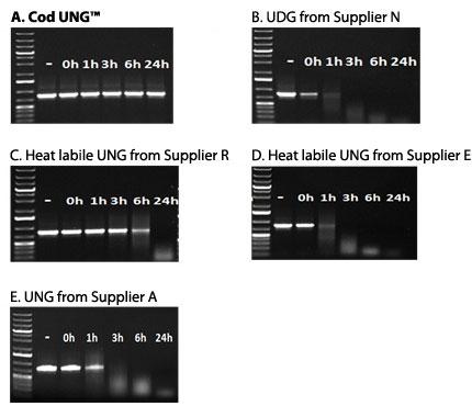 There are several commercially available Uracil-DNA glycosylases on the market today. Most of them are of bacterial origin and work well if you have no intention to further analyze the PCR products post-PCR. However, if you want to store your PCR products for downstream analysis such as cloning and sequencing, the reactivation of UNG and subsequent degradation of your PCR products are a problem with most of the commercially available UNGs. Cod UNG from ArcticZymes is the only commercially available UNG today which is completely and irreversibly inactivated by heat. This is illustrated in Figure above, where various UNGs were tested for residual activity after heat inactivation. PCR was performed with dUTP and 1 Unit of 5 different commercially available UNGs. Post-PCR, the PCR products were incubated at room temperature for various time intervals, followed by heating and subsequent cooling. Gel electrophoreses of the PCR products revealed UNG reactivation, and thus severe degradation of PCR products of all UNGs tested, except for Cod UNG.