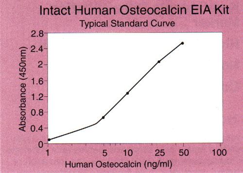 The BTI Intact Osteocalcin EIA measures only intact osteocalcin which is synthesized de novo by the osteoblast and it eliminates any interference by circulating fragments.  The assay is a sandwich EIA which employs two monoclonal antibodies directed towards the amino-and the carboxy-terminal regions of the human osteocalcin.  It recognizes only intact osteocalcin, requiring the full 49 residue protein for detection. This assay reacts with human, bovine, monkey and dog osteocalcin.
